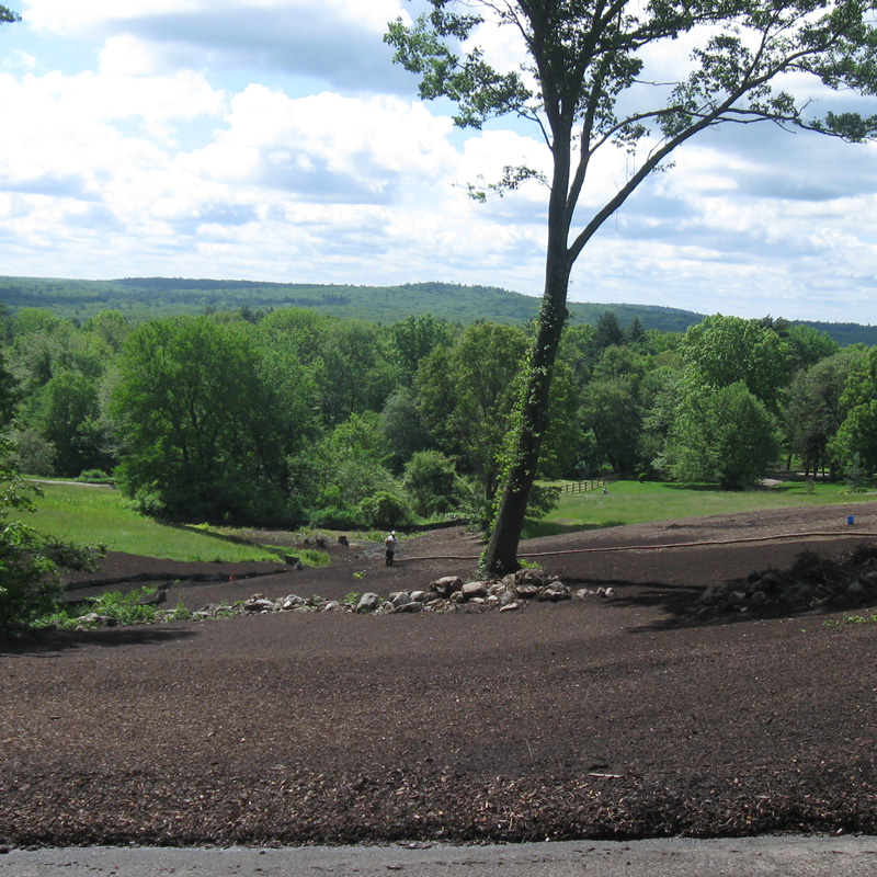 EarthBlanket™ is a compost-based erosion control system developed by Groundscapes Express, Inc. to stabilize exposed soil and protect it from erosion caused by rainfall and stormwater runoff. It consists of a layer of organic mulch made from finished compost blended with partially decomposed wood fibers, typically using FiberRoot Mulch™ or PowerBoost Mulch™ materials. Applied directly to bare soil, usually with a blower truck, EarthBlanket™ absorbs rainfall impact, slows runoff, and helps prevent soil from washing away. The compost layer also supports beneficial microbial activity that can filter sediment and break down pollutants in stormwater. Because it is made from natural, biodegradable materials, EarthBlanket™ gradually decomposes into the soil, improving soil health and promoting vegetation growth without the need for removal.