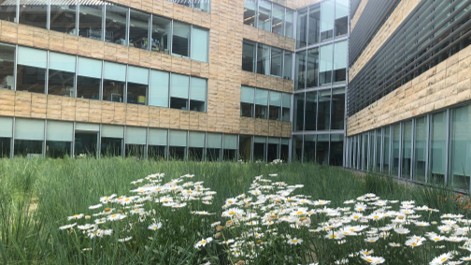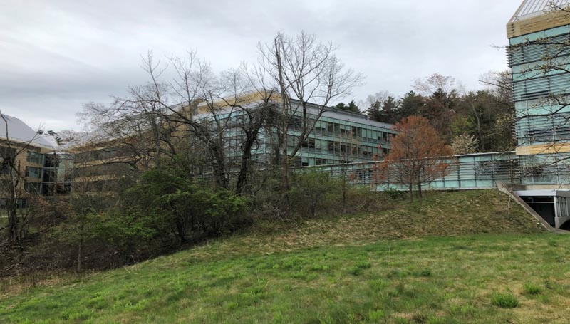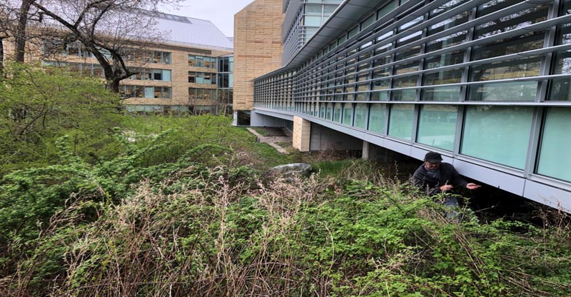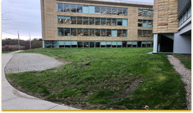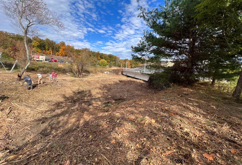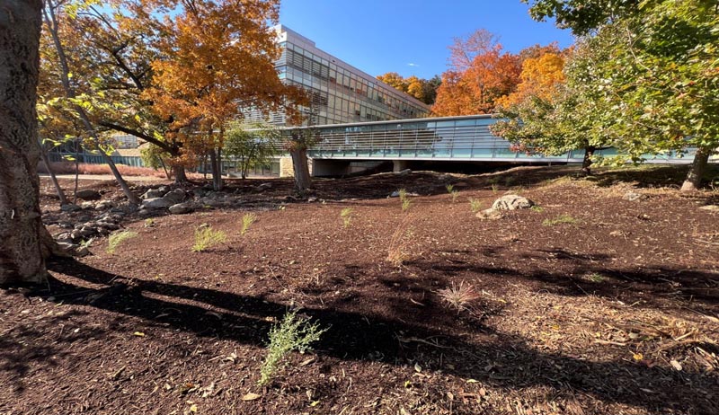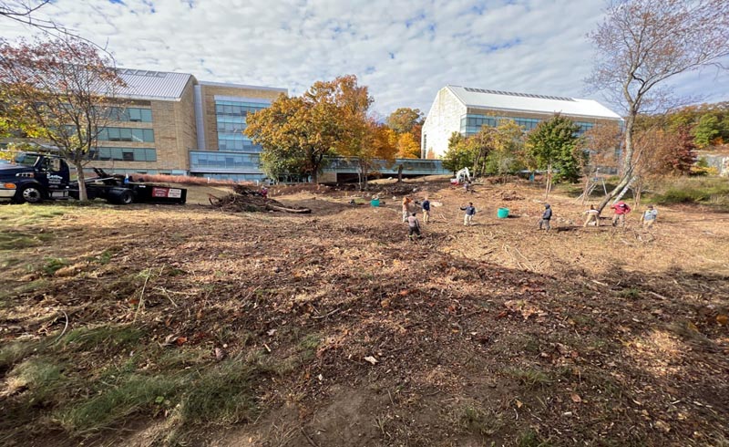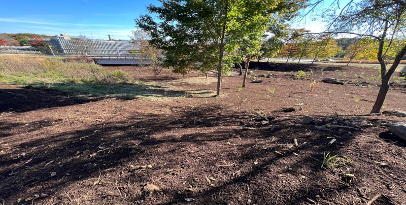 Retention pond was not properly maintained. Removed invasive plants and installed native plantings. Work completed in 3 days, AstraZeneca, Waltham, MA.